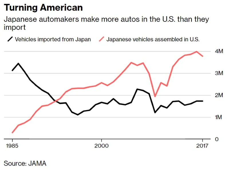 Bloomberg put together this handy chart using data from the Japan Automobile Manufacturers Association (JAMA) showing that 69 percent of the Japanese cars sold in the U.S. are built domestically while the other 31 percent are built in Japan and imported to the States. That’s a huge contrast to what those numbers were in 1985 when 91 percent of cars from Japanese automakers sold in the U.S. were built in Japan. That’s a 45 percent drop in imports over 33 years.